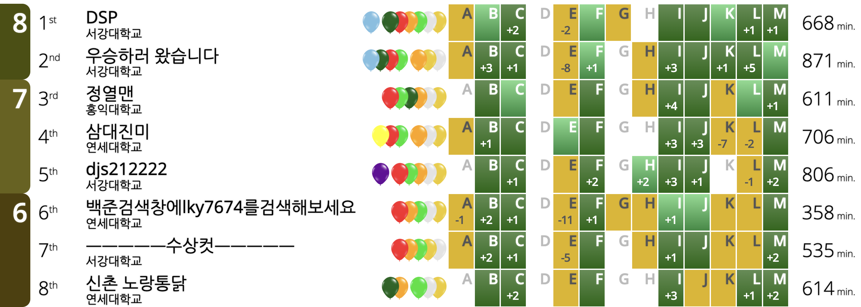 아니 대회 시작한지 얼마나 됐다고 갑자기 dong_gas가 있는 DSP 팀에서 3분만에 퍼솔을 내버렸다.문제가 풀린 걸 확인하고 바로 코딩에 들어갔는데도 7분에 솔브를 했는데, 3분솔브는 진짜 말이 안된다.단순 구현이고 내가 설거지하기로 했어서 바로 코딩하고 AC